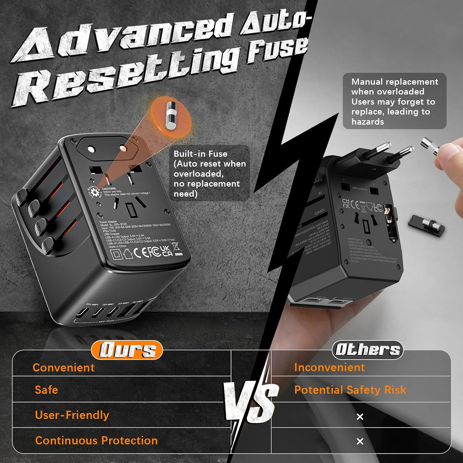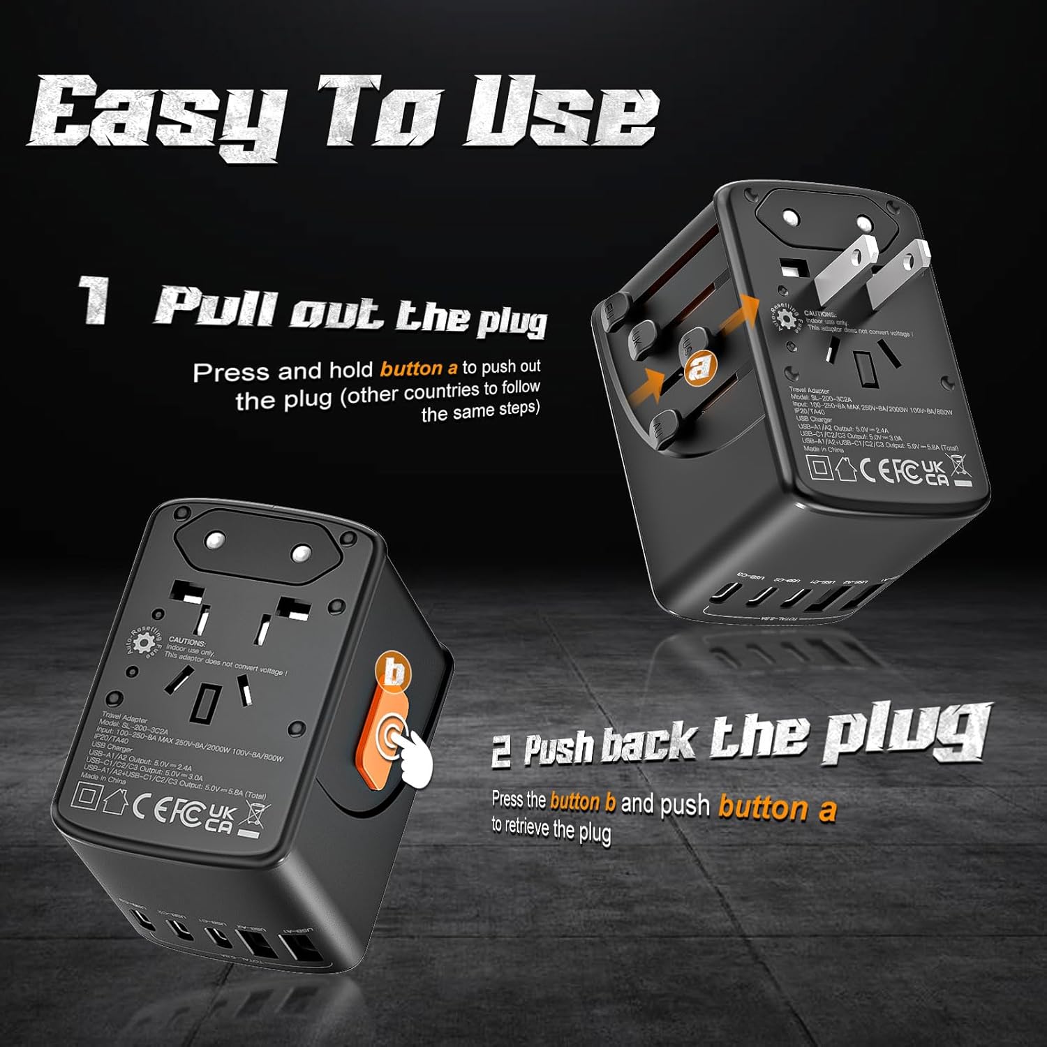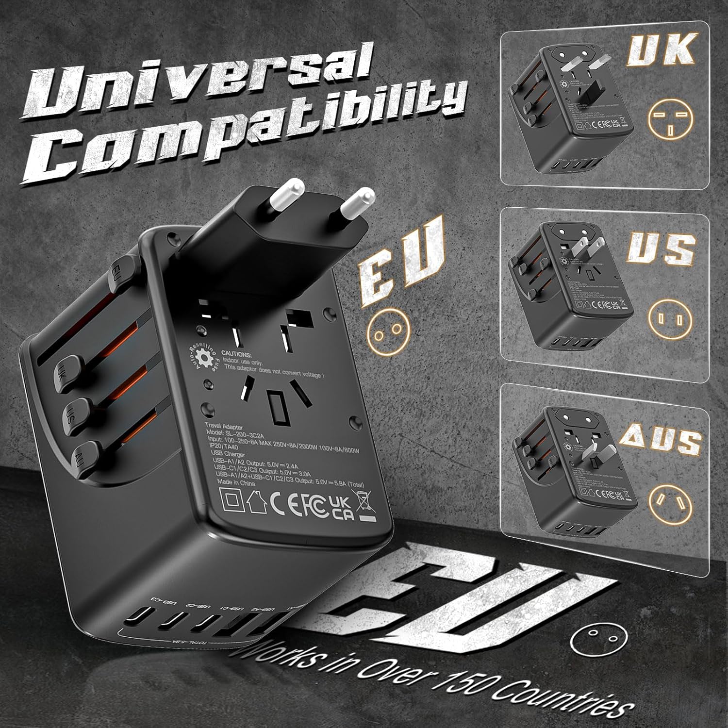 Featuring a robust 5.8A output, this travel adapter ensures that all your devices are powered up quickly and efficiently. With a 3.0A Type-C port and a 2.4A USB port, you can charge multiple devices simultaneously, from smartphones and tablets to laptops and cameras.
