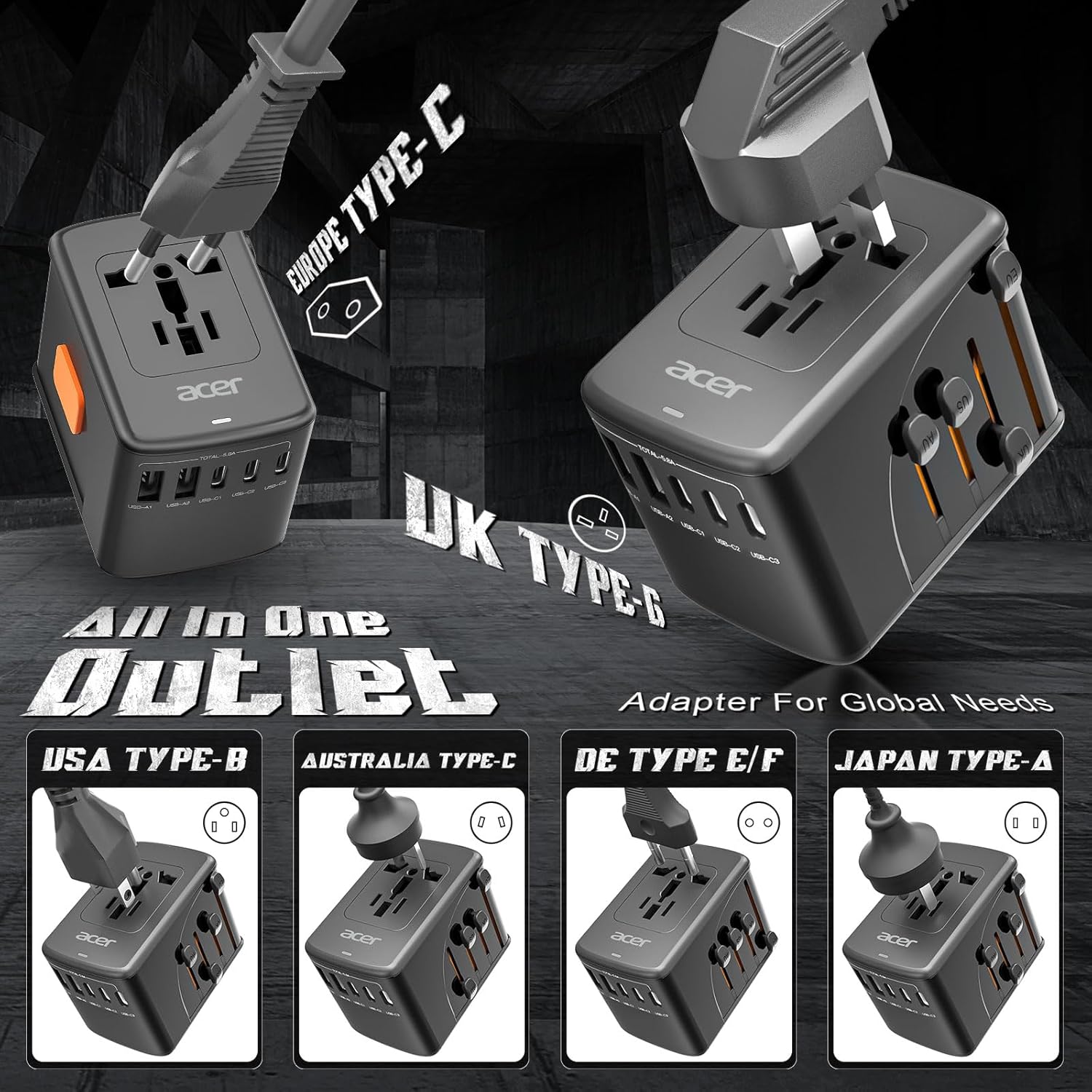 Acer Universal Travel Adapter, International Power Adapter with 5.8A Output, Baby-Proof Wall Charger with 3.0A Type-C & 2.4A USB Ports, Powerful & Safe Travel AC Plug Adapter for Europe,UK,US,AUS